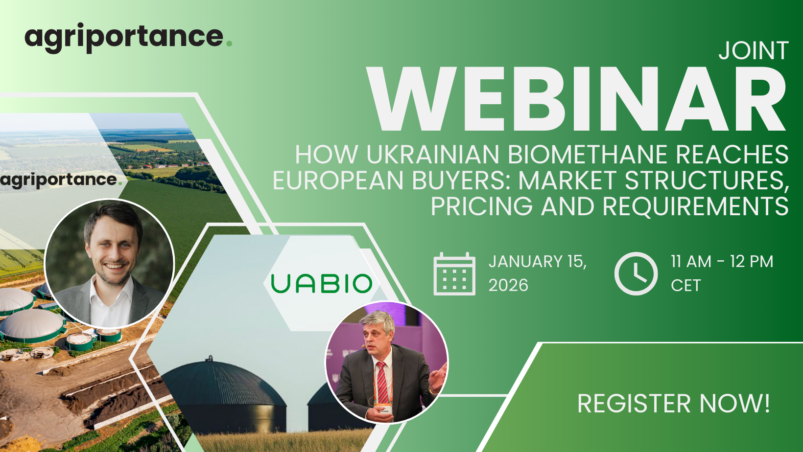 In this joint webinar hosted by UABIO and agriportance GmbH, you will gain insights into the development and prospects of biomethane production in Ukraine and the latest developments shaping the European biofuel market.